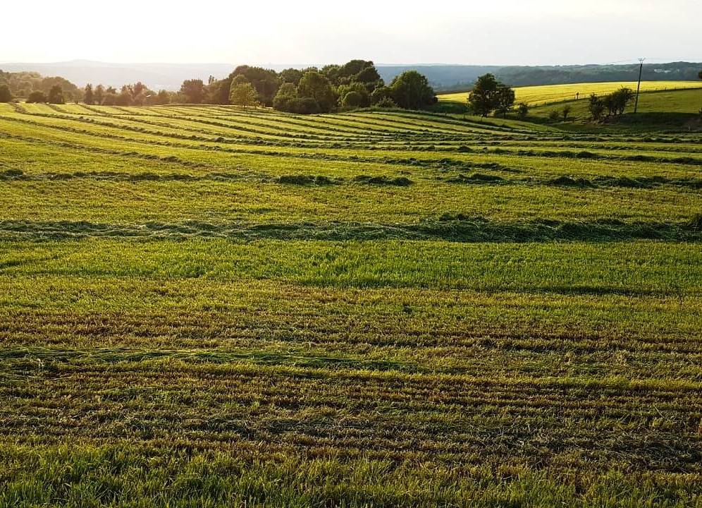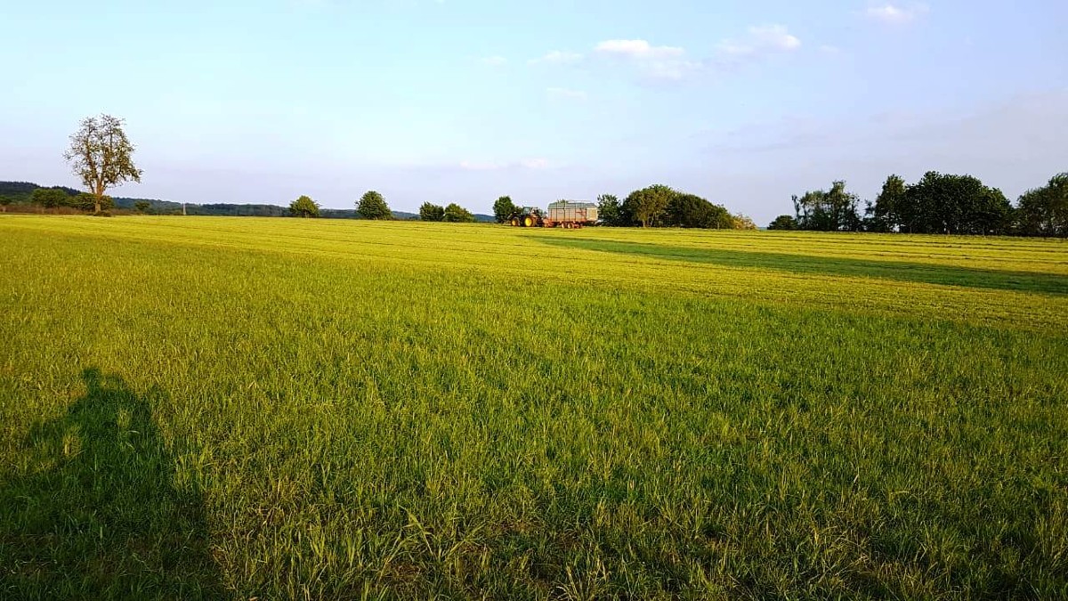 Unsere Flächen wurden für ein mehrjähriges Umweltprogramm mit einer speziellen Grünlandmischung eingesät. Unsere Ziel ist eine Verbesserung der Artenvielfalt von Pflanzen und Insekten. Auf diesen Flächen ernten wir das Futter für unsere Tiere.